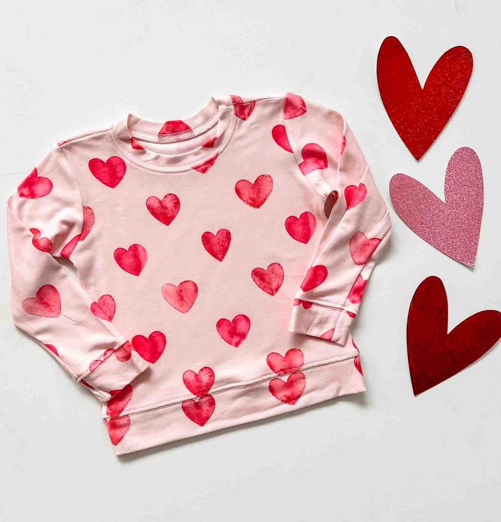 Fall in LOVE at first wear. Our Valentine's Kids Pink Sweatshirt is sprinkled with red watercolor hearts for an all-over print that's sweet as your little one. This cozy sweatshirt is made from a super-soft fabric that feels gentle on skin and comfy for all day wear.