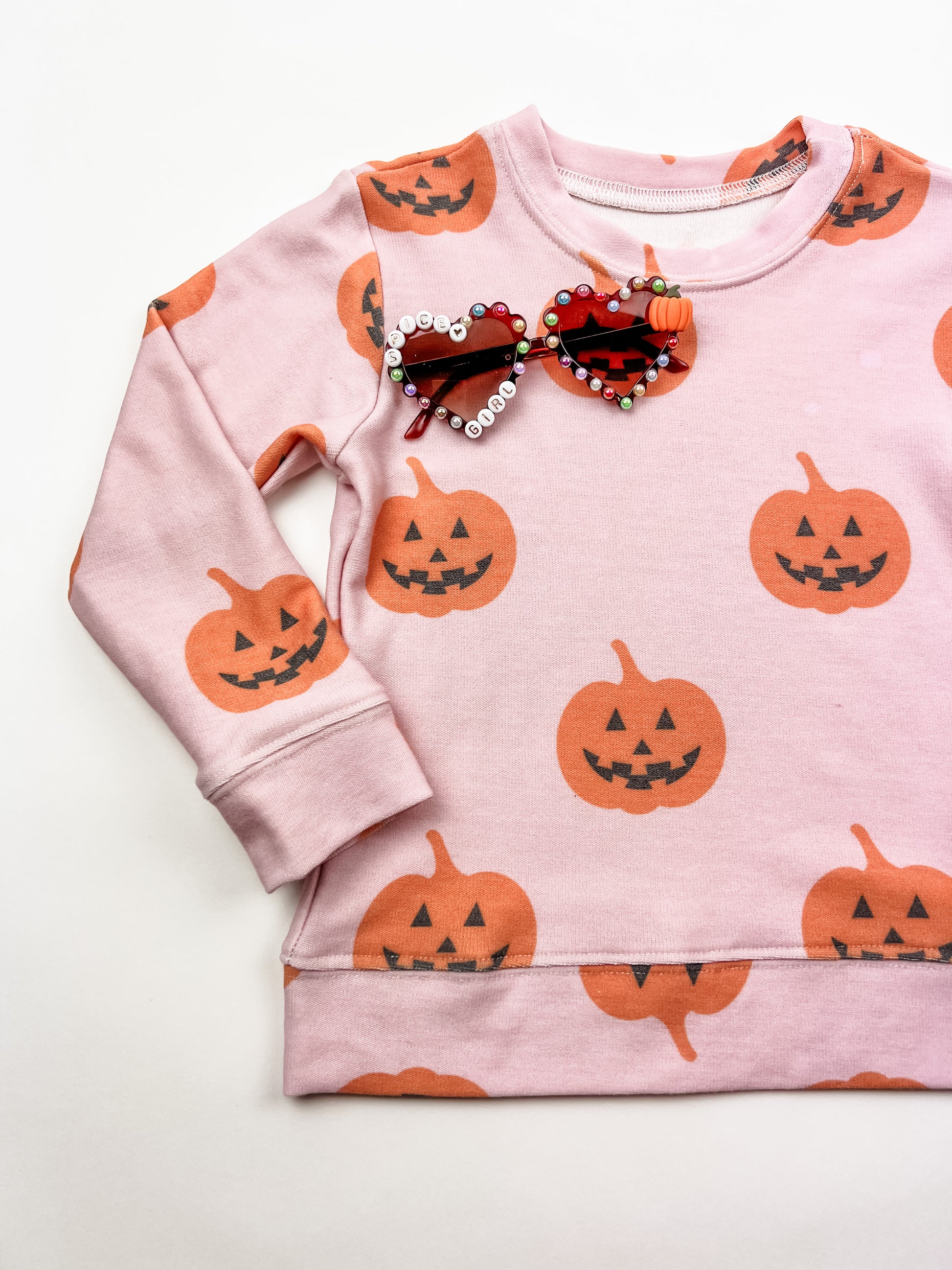 Time to get festive in this jack-o-lantern sweatshirt in a soft pastel pinkish purple color background with jack o lanterns. Perfect for a school halloween party, the pumpkin patch or spooky season.