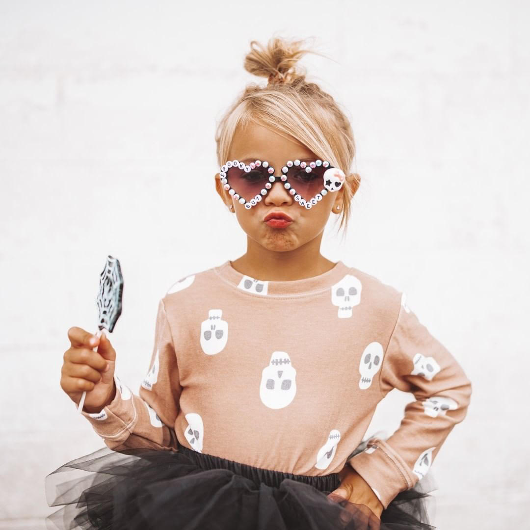 The sweetest little skull face sweatshirt with a latte colored background makes for the perfect spooky season sweatshirt. Also available in Women's size for a matching look.