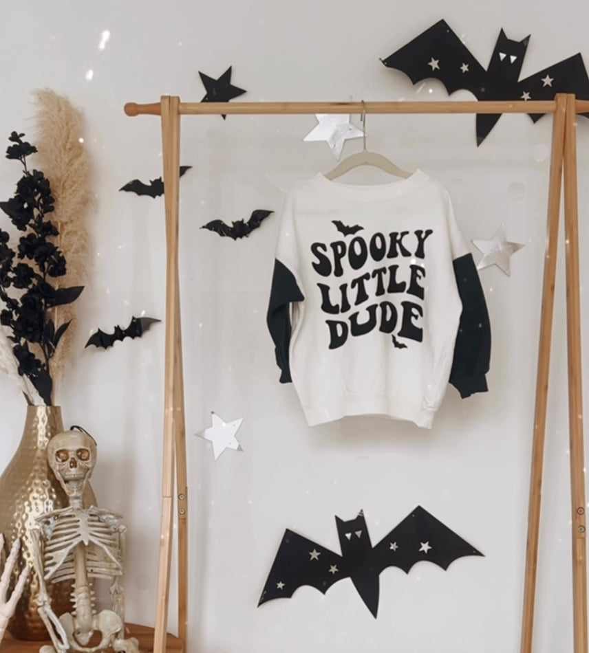 This contrast drop shoulder sweatshirt with Spooky Little Dude printed on it is a fun and festive style for your little dude.